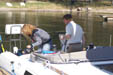 Grinda-Gåshaga. Vi packade ihop oss och blev vittne till ett fasansfullt slagsmål mellan, svanar!!! De var verkligen elaka, de försökte dränka varandra och det höll på länge. Vi gick för motor och den ende som hade klätt sig rätt var Christoffer (shorts), för det var himla varmt och ingen vind. Vi provade segla men det var utsiktslöst. När vi skulle starta motorn så ville inte den. Vi lät den vara en kvart och då fick den ett ryck och gick igång. När vi kom i hamn kom Laila och Arne och hälsade på, de hade varit på konsert med Bruce Springsteen. Irene och Göran var också med. De tyckte att det var en fin båt och vi bjöd på fika sen åkte var och en hem till sig, hej då båten ! Unga seglare.