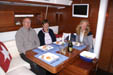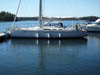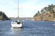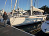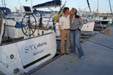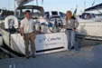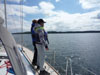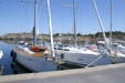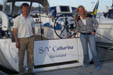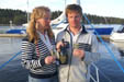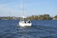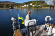 Gåshaga, Lidingö. Äntligen, på väg, lyckan är total ! Det har t.o.m. varit svårt att sova när man vet att båten är sjösatt. Vi anlände lite för tidigt så båten var inte färdigstädad ännu. Personalen hojtade "Kom inte hit". Vi kunde knappt bärga oss, vi som hade vätat så länge, fyra hela månader. Nu var det äntligen dax att ta S/Y Catharina i besittning, vi kände oss lite pirriga. När vi så fick komma och se henne i vattnet för första gången var hon magnifik. Vi gick in direkt och fick en grundlig genomgång av allt i båten av Martin, Tomas och Stig, vi ställde frågor och de svarade tålmodigt. När vi kände oss färdiga önskade dom oss lycka till med en flaska champagne i kylen, fint !! Vi började att packa in våra saker i båten,