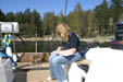 Inför upptag i Klockestrand. Catharina målar vagnen med rostskyddsfärg, visst blir den tjusig, hoppas nu bara att båten får plats. Nymålad vagn dock ej hela, eftersom vi ska ta bort mer onödigt skrot nästa år.