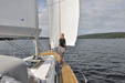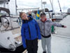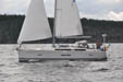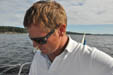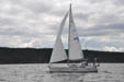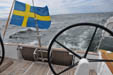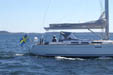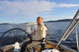 Vår första tävling. Upp tidigt för att starta i Härnösand, vi fick med oss en extra gast som hette Arne som var från Umeå och hade båt i Härnösand. De hade själva tänkt tävla men familjen backade ur. Det var tur för oss, för vi behövde verkligen en till ombord. Det var mycket vind och vi tog oss till Härnösand för skepparmöte. Starten gick vid 11 och vi höll oss undan de andra båtarna så gott vi kunde eftersom vi inte är hundra på väjningsreglerna. Bättre fly än illa fäkta. Vi missade lite i starten men det hade ingen större betydelse, för de som hade spinnaker bara blåste iväg och vi andra kom efter lite saktmodigt tills vi närmade oss Snettis då fick vi också fart. I gattet mellan Hemsön och Storön rullade det in gammal dyning, ca. 3m höga berg kom emot oss. Det blev kryss och plötsligt upptäcker vi att förseglet bara rasar ner. Arne och Magnus lyckas bärga det efter en stunds hårt arbete och i.o.m. detta blir vi efter igen. Vi sätter fast förseglet i spinnakerfallet och hissar det igen, det andra schacklet har antagligen öppnat sig och farit till havs. När vi fått ordning på grejorna tar vi upp jakten igen och slutar sist i vår premiär. Vi gjorde det bra som klarade tidlimmiten för det var inte alla som gjorde det. På kvällen bjöd vi in Arne med familj på lite vin och snacks innan surströmmingsskivan i segelsällskapets hus på Lustis. Vår första tävlingssegling, men inte den sista, så se upp här kommer vi !