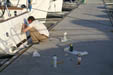 Värns-Bönhamn. Vi vaknade till ösregn, så vi tog det lugnt, vi åkte motorbåt till Bönhamn och la till jämte en fin Lady Hellsman. Vi tog en promenad och betalade hamnavgiften. Vi träffade en Härnösandsbåt, en Sealine. Vi hjälptes åt att fiska upp ett grytlock som av misstag hamnat i vattnet. Han var över och tittade på vår båt senare och vi åt faktiskt mat ute i brunnen, ganska fint väder. Det var härlig stämning med allsång och gitarrer på en brygga. Fullt ös på folk. |