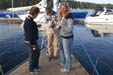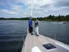 Västerholmen-Gåshaga-Bockholmen. Catharina hade sovit dåligt efter drömmar om fästingar och grundstötningar. Vi vaxade och grejade med båten lite, för idag ska vi gå till Gåshaga för att fiska upp Mamma, Arne och Frasse. Vi möttes av dimma, men den lättade fort. Väl i Gåshaga storstädade jag så att hon skulle vara ren och fin. Vi tog en fika med de nyanlända matroserna och sedan gav vi oss av. Vi hade bestämt oss för Bockholmen, vi hissade segel och seglade tom. genom den trånga genvägen vid Vaxholm. Vi hade kanonväder, solen i sittbrunnen hela dagen. Vi landade mot en klippa snyggt och prydligt. Alla var överens om att det var en underbar kväll, helt vindstilla i viken. Killarna fiskade lite, Frasse fick en strömming. Vi åt löjromsmacka och sedan grillade vi regnbåge och gjorge löjromssås till. Färska potatis och sallad till. Det smakade underbart !! God natt ! Frasse, Arne och Mamma på besök.