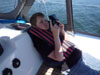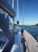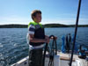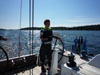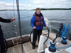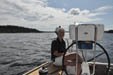 Stora jolpan-Gåshaga. Vi klev upp tidigt för vi skulle släppa av mamma och Arne och så skulle Tores grabbar fixa med vår båt på eftermiddagen. Vi seglade den mesta vägen. Vi gick samma kanal tillbaka för den var så mysig med alla hus och bryggor. Vi sa adjö till mamma och Arne. Felix, Bibbi och jag tog Lidingöbanan till Gamla stan. Felix tyckte det var kul att gå runt i gamla stan och titta. Mycket folk, vi tog en glass och fortsatte att vandra runt tills Felix ledsnade, då åkte vi tillbaka till båten. Under tiden hade grabbarna skurat däcket och fått kapellbågarna och fästena fixade. Ännu återstår en del fix innan det är klart. På kvällen gick vi till restaurangen och åt. Vi hade fått pengar av mamma. Felix och jag åt hummer, Magnaus åt filé och Frasse en stadig Blackangusburgare. Middagen var kanongod! Arne är skeppare och Magnus kan koppla av.