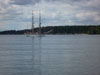 Gåshaga-Utö Vi kom överens om att gå till Utö. Vi gick genom Baggens kanal innan vi hissade segel, Frasse tyckte att det var helläckert att segla mitt i Stockholm. Vi seglade i sakta mak tills vi var tvugna att kryssa över Erstaviken, vi kom upp i 8.7 knop så det rörde på sig. Vi blev fenor på att slå men det jävlades hela tiden. Skoten fastnade vid spirbommen som sitter på masten, till sist lossade hela bommen men Frasse fick tag i den och fick fäktas med slående skot och bom. T.o.m. lattorna for ur seglet. (Vi lärde oss senare att seglet var felsytt, det ska inte kunna hända) Vi halade seglen och gick för motor över Mysingen och jag passade på att göra gubbröra till dagens förrätt. Vi landade och åt gubbröra på en gång för vi var så hungriga, till middag blev det kycklinglevergryta, Frasses favorit. Vi satt uppe och pratade tills Stig nästan somnade. Några bilder från dagen: