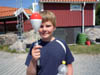 Bockholmen-Stora jolpan, Paradiset. Frasse var uppe och stökade tidigt, han trodde klockan var tio, men hon var sex !! Felix var på lekhumör så vi provade att tolka efter Catharina, det slutade med en blöt Felix. Vi seglade till Paradiset på Stora Jolpan, en jättefin hamn, bryggan följde klipporna. Hela ön är naturreservat, vi tog en långpromenad. Där fanns restaurang, affär och vandrarhem. Mamma bjöd på glass när vi kom till affären, det var gott, för det var så varmt. Vi köpte lite fiskegrjor och mask. Felix fick en abborre och jag fick en strömming. På kvällen grillade vi kött och Bibbi hade gjort en fantastisk kantarellsås till. Vi satt ute hela kvällen som var helt underbar. Bilder från en fantastiskt fin Stockholms skärgård.