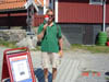 Kärringsund-Öregrund. Vi klev upp tidigt för de hade lovat dålig vind, så det kunde ta tid. Vi provade att segla en stund, men vi gav upp. Vinden kom senare, läns och sedan platt, så vi provade vår spinnakerbom till förseglet och det funkade det också. När vi kom fram till Öregrund var det fullt på insidan, så vi la till med aktern mot bryggan på utsidan, vinden låg på rakt in. Bojen draggade så det var tur att vi hade satt fendrar mellan överallt. Det skvalpade och gungade som bara den. Vi bunkrade och så bestämde sig Frasse för att mönstra av och hälsa på en polare. På kvällen kom det en båt med onykter besättning och skulle lägga till ofendrade, men Magnus blev arg och sa att de var tvugna att gå ut och fendra. De for ändå in i vår båt, tur att jag hade en fender med mig och Magnus skickade ut dem igen, men de kom inte en gång till, flera båtar var upprörda. Det blev grillade köttfärsspett till middag det var gott ! Över till Sverige igen och med aktern in i bryggan för bojen draggade i Öregrund